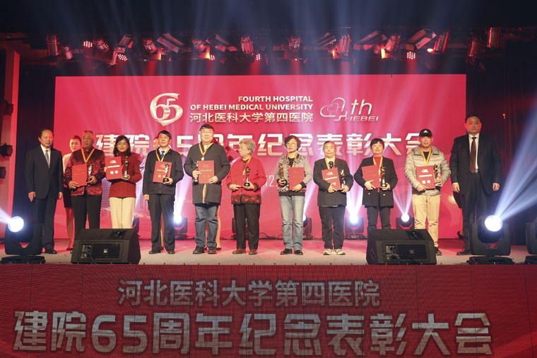 我院用精心准备的配乐朗诵《大医精诚》,舞台剧《战癌壮歌》、《心系赞皇》,舞蹈《迈进新时代》、《红烛》、《共圆中国梦》,民乐演奏《良宵》,歌曲《为了谁》,快板表演《医路逐梦》,合唱《河北医大四院院歌》,大型歌舞《白衣薪火》以及老前辈和青年人拍摄的祝福视频等形象生动地展现出一代代四院人在不同历史时期,用医者仁心和大爱无疆诠释医学誓言的感人事迹,表达了对建院65周年的热情庆祝和殷切祝福。现年85岁的林元珠教授在接受采访时说:“能够参加建院65周年纪念表彰大会让我感到非常荣幸,支撑我在医学领域不断探索、努力工作的动力就是因为我有为共产主义事业奋斗终生的伟大信仰。希望年轻的四院人能够胜过我们,长江后浪推前浪,一代更比一代强。”