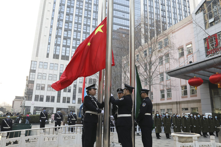 清晨凛冽的寒风中,英姿飒爽的升旗队、护旗队迈着整齐划一的步伐护卫着国旗出场。国歌激昂,冉冉升起的五星红旗成为蓝天中最耀眼的红。院歌奏响,院旗在注视的目光中迎风飘扬。
