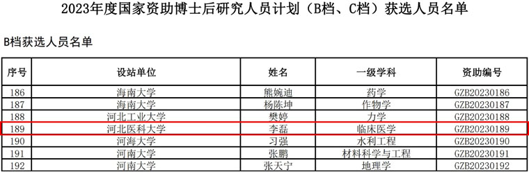 近日,全国博士后管委会办公室和中国博士后科学基金会公布了2023年度国家资助博士后研究人员计划(B档、C档)获选人员名单,我院科研中心李磊博士后为河北医科大学唯一获得B档资助人员,其合作导师为单保恩教授。据悉,本次共确定4617名获选人员,河北医科大学有2位博士后获得资助。李磊博士后的入选标志着我院人才培养工作取得新成果,对医院建设完善新型人才培养模式有重要意义。
